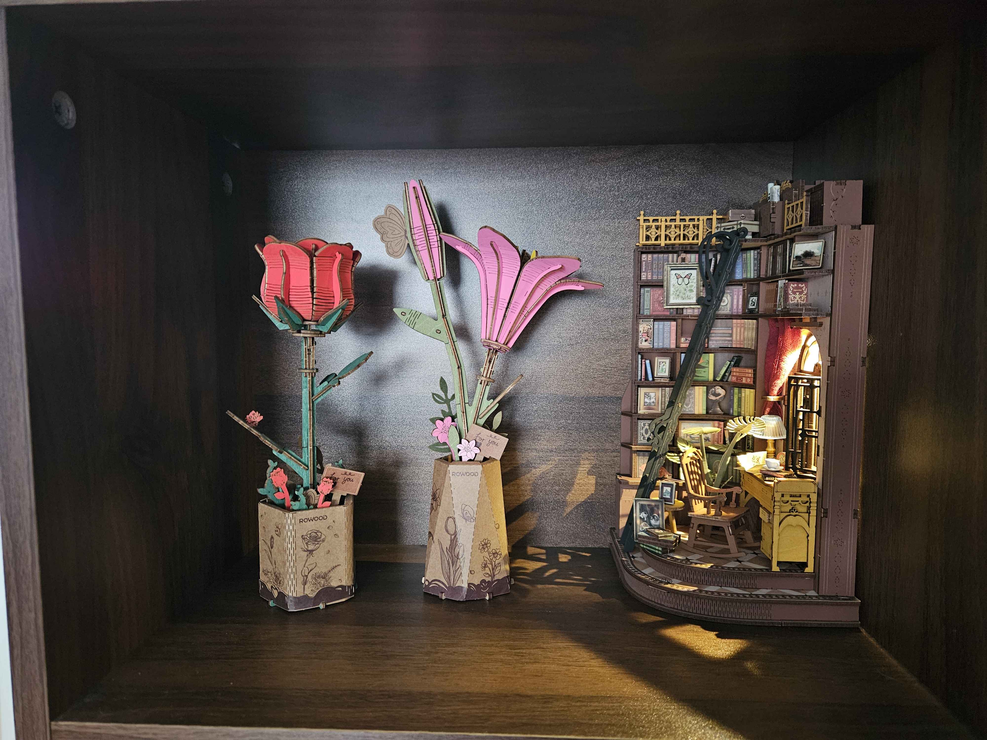 gotten into little wooden builds from a local game store, they're so lovely and nice to work on. the little flowers are only $10 also which is great. my partner built the rose :) the little book nook in the corner has a little touch activated light! the line of those style ones is like $45 but man was it fun to work on. spent a whole afternoon working on it at my coffee table with my partner playing pokemon on the bed. had some snacks and a podcast and a frickin' lava lamp. it was a good afternoon. i wanna get the whole line of those also but i'm gonna have to spread them out since they're more expensive. i'll post the other ones when i get them too :)
